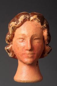 Figura femminile.Testa tornita, scolpita e dipinta, incarnato chiaro. La testa è stata ridipinta solamente con colore di fondo.