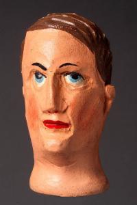 Testa tornita e scolpita, incarnato chiaro. Capelli dipinti di colore marrone e scolpiti con riga laterale. Occhi di colore azzurro. La bocca è chiusa con labbra rosse. Il volto è leggermente deformato occhi e labbra dipinte. Integro funzionante.