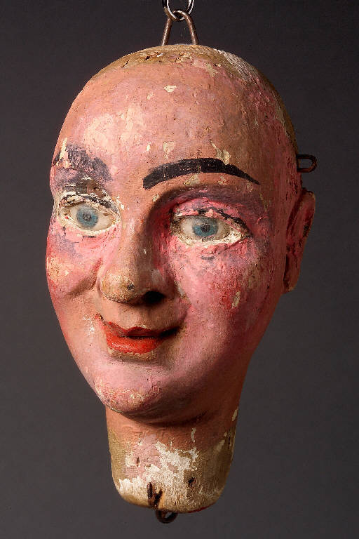Testa di legno finemente scolpita, incarnato chiaro, occhi di pasta vitrea, labbra dipinte di rosso. Sulle tempie sono inserite le chiambrette per l'inserimento dei fili alla testa. Sono presenti anche fori nella parte superiore della testa che tenevano una fettuccia alla quale con spilli si fissava la parrucca. Senza capelli con occhi in vetro. Incompleto non funzionante.