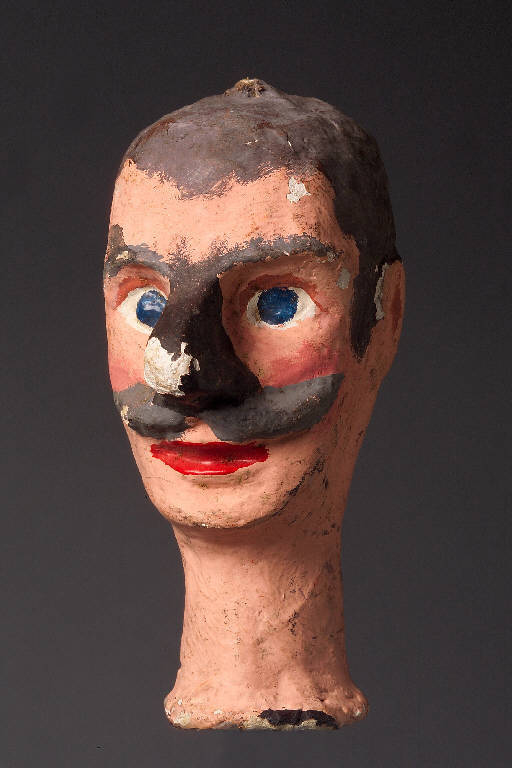 Testa di cartapesta rinforzata all'interno con canapa. Baffi e capelli dipinti.