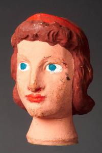 Testa tornita e scolpita con capelli e copricapo rosso dipinti. La dipintura originale è stata sostituita recentemente. Integro funzionante.