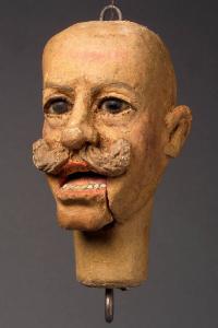 Testa finemente scolpita con baffi pronunciati, occhi in pasta vitrea, bocca mobile sulla quale sono scolpiti la lingua e i denti bianchi, labbra rosse. Alla sommità del capo e sotto il collo sono presenti ganci. Integro funzionante.