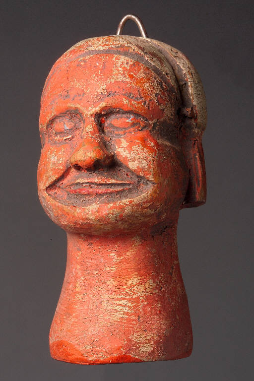 Testa tonita e scolpita, il colore originario è stato coperto e sostituito con un colore di fondo arancione che non ha interessato completamente la berretta bianca e il fiocco rosso. Integro non funzionante.