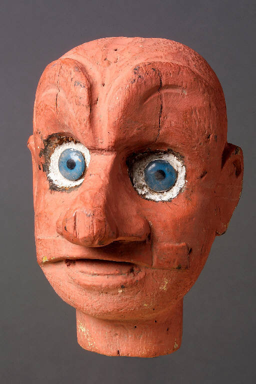 - NOTIZIE STORICO CRITICHE Teste prodotte artigianalmente in serie dalla prima metà dell'800 fino alla seconda guerra mondiale. Le varie famiglie di scultori si specializzavano nei soggetti che affluivano ad un committente che le acquistava.\nQuesti le cedeva a venditori ambulanti che riempivano le gerle di queste teste e di altri manufatti in legno prodotti nella zona (giocattoli,stoviglie,ciotole). Si ritrovano teste in collezioni di varie parti d'Europa dall'Inghilterra alla Grecia, dalla Francia ai Paesi dell'est Europa. In Italia sono presenti nelle seguenti collezioni pubbliche:Museo Teatrale alla Scala, Scuola Paolo Grassi, Museo Faraggiana di Novara, il Castello dei Burattini di Parma, Collezione Forlai del Comune di Forlì,e in numerose collezioni private, tra queste la più importante è la Collezione Mercuriali di Cesenatico. Queste teste, per la maggioranza di piccole dimensioni servivano poi per essere "vestite" e diventare burattini oppure con l'aggiunta successiva di un corpo (non prodotto in Val Gardena), diventare marionette. Le teste prodotte in dimensioni maggiori erano utilizzate da burattinai e marionettisti professionisti. Le teste dopo essere state pennellate di bianco, venivano dipinte a tempera e assumevano l'aspetto semilucido con l'aggiunta, successiva, di chiaro d'uovo. I soggetti relativi alle teste erano anche differenziati per aree culturali (Fagiolino,Sandrone,Gioppino: per l'Italia settentrionale; Guignol e Gnafron\nper la francia; Punk e Judy per l'Inghilterra, Kasperl per la Germania e i Paesi dell'Est Europeo), mentre le maschere della Commedia Dell'Arte ( Arlecchino, Brighella, Dottore, Capitano, Pantalone, ecc.), erano distribuite in tutta Europa.