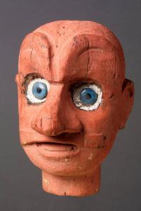 Testa tornita grezza priva di capelli con occhi di vetro azzurri. Il grande naso è stato aggiunto successivamente. Il labbro superiore è evidenziato da una striscia di stoffa incollata e dipinta, quello inferiore, lingua e i denti sono scolpiti. L'evidenza delle sopracciclia, del naso e dei baffi fa supporre che prima del ripristino attuale la testa fosse utilizata la maschera del dottore Integro non funzionante.