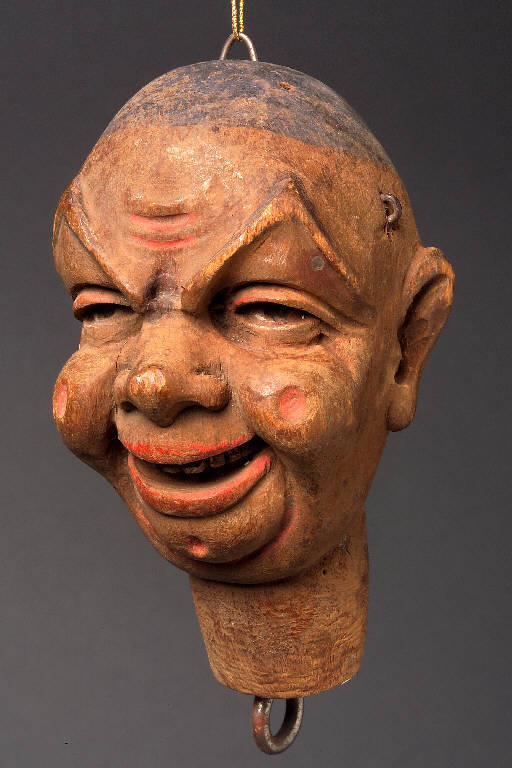 Testa scolpita con capelli dipinti. Sopracciglia e occhi sono scolpiti e dipinti. Incanato scuro.\nZigomi molto pronunciati con fossette circolari colorate di rosso, uguali a quelle del mento. Bocca sorridente con labbra rosse scolpite che lasciano intravvedere i denti bianchi scolpiti. Sulle tempie sono applicate le chiambrette per l'inseriemto dei fili. Nella parte superiore del capo e sotto il collo sono presenti ganci. Integro funzionante.