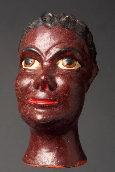Testa tornita dipinta di nero, capelli ricci, neri, scolpiti. Occhi grandi dipinti di colore giallo. Naso regolare, bocca chiusa, dipinta di rosso. Integro funzionante.
