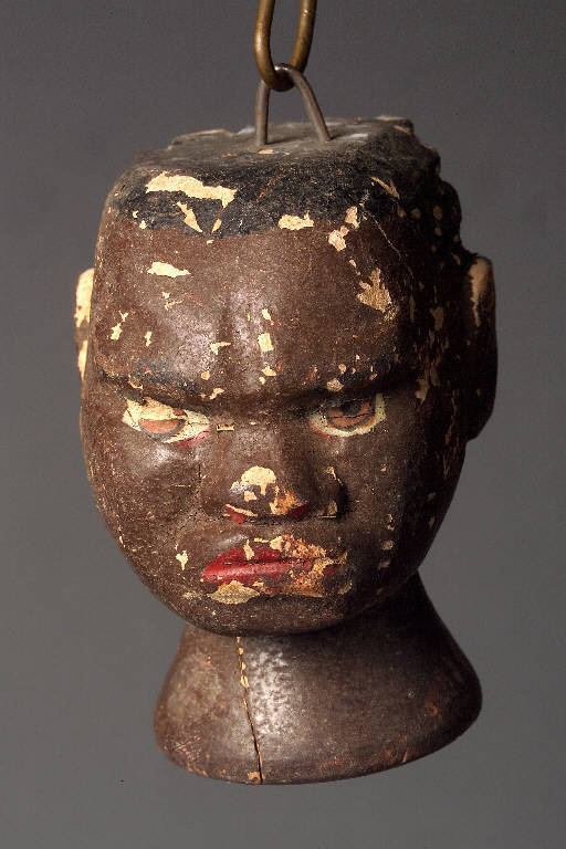 Testa tornita dipinta. Capelli scolpiti neri. Il viso nero, presenta molte parti con pittura mancante.Gli occhi dipinti hanno scrostature insieme alla bocca dipinta di rosso. Gancio nella parte superiore della testa. Integro funzionante.