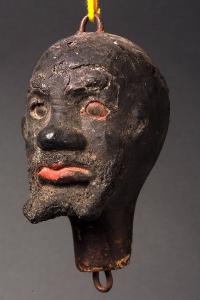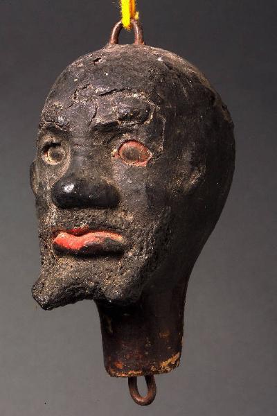 Viso scuro senza capelli con occhi dipinti, di cui uno di vernice rossa. Baffi scolpiti e pizzo a due punte, le labbra sono chiuse e dipinte di rosso. Gancio nella parte superiore della testa e sotto il collo. Integro funzionante.