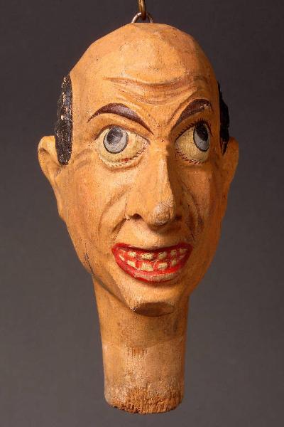 Testa scolpita con incarnato chiaro. Capelli dipinti. Sopracciglia e occhi azzurri scolpiti e colorati. Rughe d'espressione, sorriso con labbra aperte da cui si intravvedono denti incisi di colore bianco. Gancio alla sommità del capo. Integro funzionante.