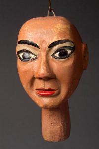 Testa scolpita e dipinta con incarnato chiaro. Completamente priva di capelli. Grandi occhi scuri scolpiti e dipinti. La bocca è chiusa con labbra scolpite dipinte di rosso. Gancio alla sommità del capo. Integro funzionante.
