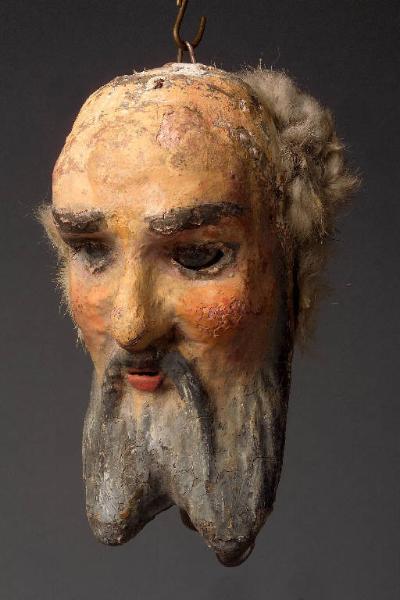 Testa scolpita con barba folta e baffi spioventi scolpiti e dipinti. Capelli di pelo animale bianchi. Cavità oculari con occhi molto infossati di vetro e ciglia applicate. Bocca piccola con labbra a fessura colorate di rosso. Gancio alla sommità del capo. Integro funzionante.