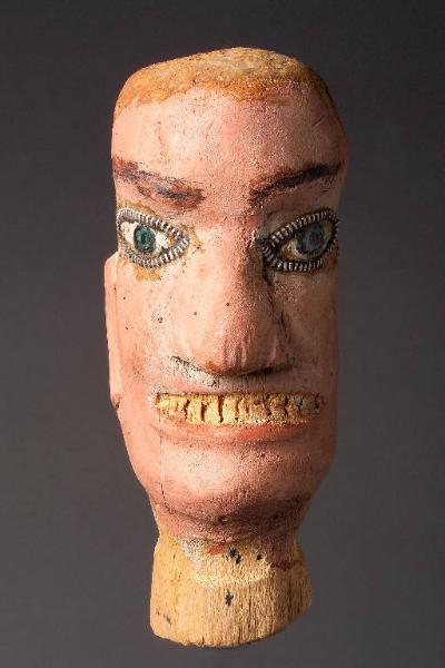 Testa scolpita in modo molto primitivo con capelli e sopracciglia dipinti, occhi di colore azzurro e contornati da lampo di sartoria. La bocca è accennata con denti intagliati. Integro funzionante.