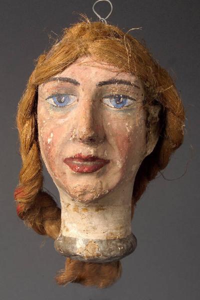 Testa finemente scolpita adattata a marionetta. Incarnato chiaro, sopracciglia e occhi dipinti di azzurro. E' stata aggiunta una parrucca di capelli in fibra naturale biondi raccolti in due trecce. Bocca con labbra dischiuse di colore rosso. Alla sommità del capo è stato aggiunto un gancio. Integro non funzionante.