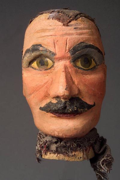 Testa scolpita con capelli di tessuto dipinto applicato, presente anche sul collo. Sopracciglia e baffi scolpiti di colore marrone. Occhi marroni con contorno giallo. La bocca è accennata e sotto i baffi è dipinto il labbro inferiore rosso. Alla sommità del capo è presente un gancio. Integro funzionante.