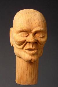 Testa scolpita non dipinta in legno naturale. Assenza di capelli . Orecchie scolpite. Cavità oculari e sopracciglia incise. Zigomi pronunciati con rughe d'espressione . Naso piccolo, bocca con labbra intarsiate socchiuse; al centro del mento è scolpita una fossetta. Integro non funzionante.
