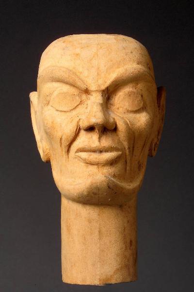 Testa scolpita non dipinta in legno naturale. Assenza di capelli . Orecchie scolpite. Cavità oculari e sopracciglia incise. Zigomi con rughe d'espressione .Bocca con labbra socchiuse. Barba scolpita che sotto il mento termina a punta. Integro non funzionante.