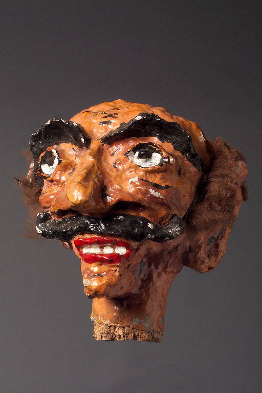 Testa modellata parzialmente calva e dipinta. Sopracciglia in rilievo di colore marrone. Occhi scavati nelle cavità oculari e colorati di bianco. Grande naso e baffi spioventi dipinti, capelli posticci di fibra naturale marroni applicati nella parte inferiore della nuca. Integro funzionante.