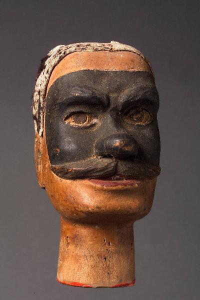 Testa scolpita a cui è stato applicato sulla testa un tessuto per i capelli presenti in ciuffi radi.Incarnato chiaro. Maschera comprendente la fronte fino ai baffi scolpiti e dipinti di nero. Occhi intagliati e dipinti di nero. La bocca è scolpita con labbra rosse. Integro funzionante.