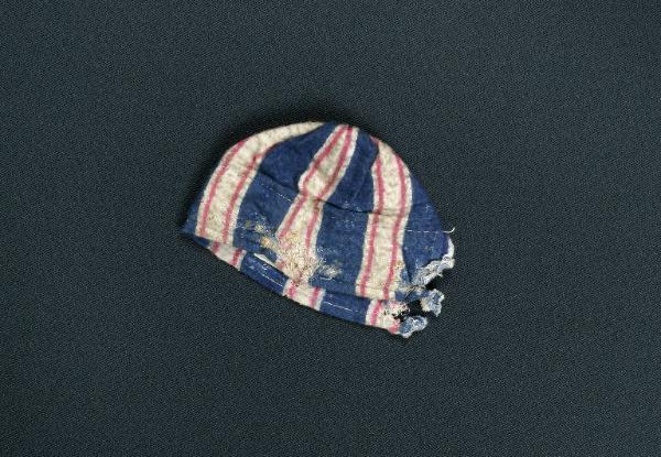 Il berretto da galeotto è di flanella blu a righe orizzontali bianche e rosse più sottiili e presenta numerosi fori da chiodi alla base per il fissaggio sulla testa del burattino.