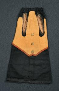 La veste è di cotone nero con fodera marrone, l'orlo inferiore e le aperture per le braccia sono bordate con traversino nero. Nel bordo superiore è inserito un cordoncino per il fissaggio a coulisse. Sulla veste è applicato il panciotto di pannolenci marrone chiaro, con l'orlo inferiore bordato con nastro marrone più scuro. Su davanti sono cuciti tre bottoni di metallo dorato con disegno floreale in rilievo.