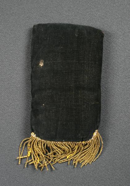 Cuscino di velluto nero imbottito e decorato con una frangia di passamaneria oro.