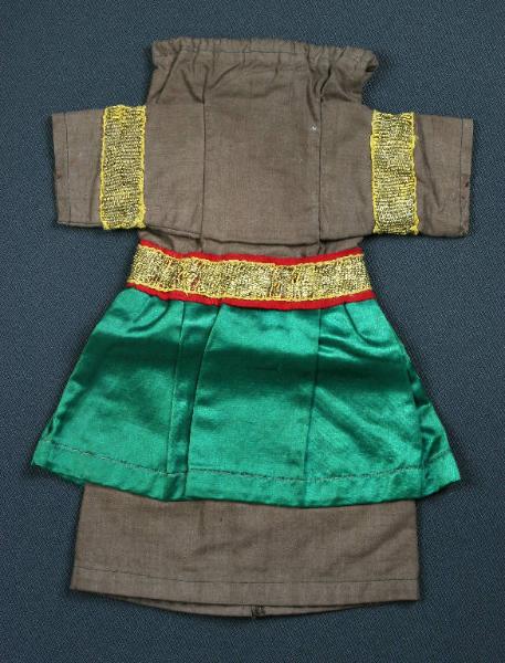 L'abito è di cotone marrone con fodera beige e con gonnellina di raso verde applicata in vita. Una cintura di lana rossa decorata con passamaneria oro, maschera la cucitura di unione. Le maniche sono bordate ai polsi con la stessa passamaneria e nell'orlo superiore è inserito un cordoncino per il fissaggio a coulisse.
