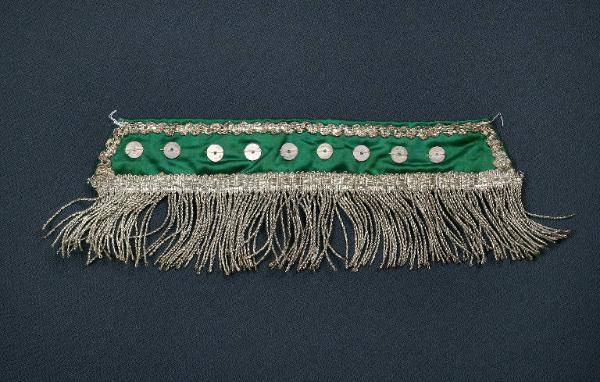 La fascia di raso verde e fodera rossa è decorata con paillettes metalliche, nastro di passamaneria argento e frangia d'argento.