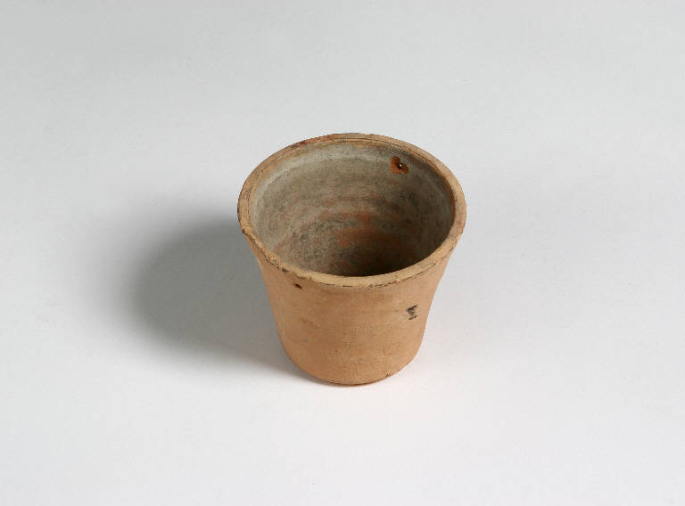 Vaso di terracotta da giardino con foro centrale nella base inferiore e due piccoli fori laterali; probabilmente veniva adoperato come elmo del burattino Sandrone.