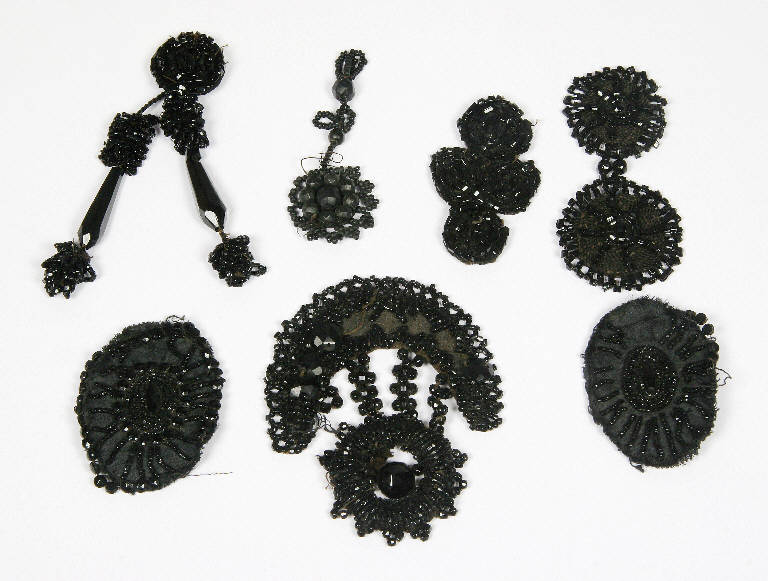 Sette applicazioni di varie dimensioni a forma di goccia, lobate ovali e rotonde. Sono di tulle nero, ricamate con filo di cotone nero e filo laminato oro, decorate con perline oro e nere e perle finte sfaccettate nere e color bronzo.