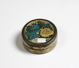 La scatola è rotonda di metallo con scritta stampata sul coperchio. Contiene un numero imprecisato di decorazioni: canoutilles nere, grani di collana di vetro nero sfaccettati e quattro pon pon di legno ricoperti di perline nere.