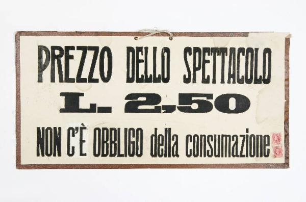 Cartello in cartone bianco con scritta realizzata ad inchiostro nero mediante cartoni per trasposizione e cornicetta in fettuccia marrone. Il cartello veniva appeso all'esterno della baracca o delle sale per indicare il prezzo dello spettacolo e avvisare che non era obbligatoria la consumazione. Reca due marche da bollo incollate con data.