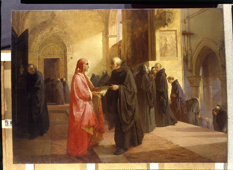 - NOTIZIE STORICO CRITICHE La tela, realizzata per il Concorso di pittura indetto nel 1844, venne esposta l'anno successivo a Brera. Il concorso prevedeva l'illustrazione di un celebre episodio, in questo caso di Dante, che netrato nel convento dei monaci agostiniani, incontra Frate Ilario al quale dona parte del testo della Divina Commedia. La tela venne giudicata assai positivamente dai contemporanei, tanto che il Boito nel 1866 scriveva "si guarda nondimeno quell'opera come un quadro che non è da scolaro". Nel dipinto la rievocazione storica ritrova quì la sua legittimazione nella verità della ricerca antiquaria e della ricostruzione ambientale. Per la definizione dell'ambiente, l'autore si richiama all'Abazia di Chiaravalle presso Milano e all'interno della Chiesa del Carmine a Milano. Il dipinto è contassegnato dal bellissimo contrasto cromatico e luministico del mantello roseo di Dante, ma anche dall'espressione del protagonista, il cui volto sarebbe quello dell'amico Domenico Induno. Per il sentimento di intimità che il dipinto riesce a evocare, la tela pare quasi una pittura di genere, caratteristica questa dettata anche dalla resa della luce quasi crepuscolare.