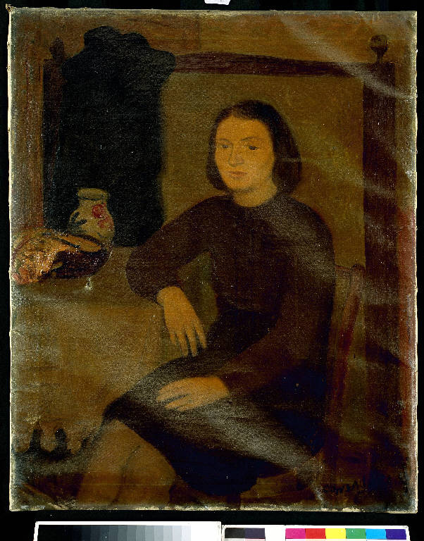 - NOTIZIE STORICO CRITICHE Le etichette presenti sul retro della tela, non solo ci informano che il dipinto venne presentato in occasione della III Mostra del Sindacato Nazionale Fascista di Belle Arti, ma anche che cooncorreva per il premio Canonica di quell'anno. La tela, risultata vincitrice, rappresentante il ritratto della moglie dell'artista, è evocativa dell'accostamento dell'artista all'esperienza secessionista di Ca' Pesaro cui si avvicina nel 1935 dopo l'incontro di Pio Semeneghini e Vellani Marco a Burano. Il dipinto, essenziale dal punto di vista compositivo, è caratterizzato dalle forme semplici dei volumi e dalla pulizia quasi schematica dei contorni in un'atmosfera quasi metafisica.