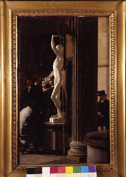 - NOTIZIE STORICO CRITICHE La tela, esposta a Brera nel 1873, venne acquistata dall'Accademia e depositata alla Galleria d'Arte Moderna nel 1902. Il dipinto, realizzato nel periodo in cui frequentava l'ambiente accademico in veste di assistente del suo maestro Pompeo Marino Molmenti, è considerato un autentico capolavoro. Di straordinario effetto teatrale è l'uso della luce che illumina il gesso, soffermandosi poi sui volti o sulle mani delle figure; in uno spazio a sé stante, si colloca l'episodio dal vero del bidello della scuola. L'opera è resa ancor più interessante per la sua costruzione: l'artista ha infatti voluto creare un ambiente intricato e ritmato da elementi verticali che scandiscono gli spazi: la maestosa colonna scanalata, l'orologio a muro, la statua di gesso. L'opera può essere confrontata con "Nello studio" di Napoleone Nani per l'uso drammatico della luce, visto che il Favretto era suo allievo nel corso di "Elementi di figura" all'Accademia veneziana.