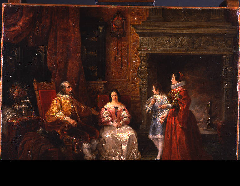 - NOTIZIE STORICO CRITICHE L'opera, tratta dal X capitolo del romanzo "I promessi sposi" di Alessandro Manzoni, illustrante l'episodio della rinuncia al voto di Geltrude, ottenne larghi favori da parte della critica come era già accaduto nel 1835, quando il Gonin presentò a Brera una tela di sogggetto analogo. L'ambientazione dei personaggi poggia su una solida cultura scenografica, come pure i costumi delle figure (il Gonin fu costumista per il "Don Giovanni" rappresentato al Teatro Carigliano di Torino nel 1828 e per il ballo mascherato tenutosi nella capitale sabauda nel 1834), volutamente teatrali, tanto che Giuseppe Sacchi sulle pagine dell' "Album" di quell'anno scrisse: "L'artista trattò stupendamente la ricca foggia degli abiti che usavansi nel secolo decimosettimo: quei suoi arredamenti spiravano un brio ed un'eleganza solennemente fastosa.". L'abilità dell'artista, troverà conferma nell'illustrazione dei "Promessi Sposi" (1840, II edizione) richiesta personalmente dal Manzoni al Gonin.