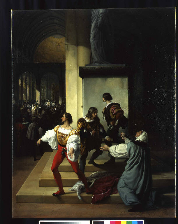 - NOTIZIE STORICO CRITICHE La tela venne commissionata dalla vedova Teresa Borri Stampa nel 1826 e consegnato tre anni più tardi, in sostituzione del "Ritratto di gruppo della famiglia Borri Stampa" che non aveva incontrato l'approvazione del committente. Tra le molteplici fonti letterarie consultate dal pittore, come testimoniano gli appunti su questo episodio tratti da Sismondi, dal Verri e dal Macchiavelli, Hayez preferirì illustrare un brano del Macchiavelli, con la titolazione "Segretario Fiorentino Libro Settimo delle Istorie": la congiura dei Pazzi diventa, quindi, la milanese congiura dei Lampugnani. L'ambientazione della scena venne totalmente rivisitata dal pittore, visto che la chiesa all'epoca si presentava con un rifacimento barocco che ne aveva snaturato l'aspetto originario; la rappresentazione è concentrata nella resa dramatica della tensione che domina le figure in primo piano, tra cui spicca la figura di Cola che sta pregando la statua di Sato Stefano, peraltro mai esistita in quella chiesa ma funzionale alla narrazione. L'opera ricorda Tiziano, dal simulacro del santo alla figura del congiurato ispirato al gentiluomo col mantello raffigurato nell'episodio "Il miracolo del neonato" nel ciclo degli afreschi della Scuola del Santo a Padova. Il dipinto acquista un maggiore valore per l'attualità dell'episodio che ricorda i fervori risorgimentali.\nNel 1993 il dipinto era segnalato in deposito presso l'Ispettorato della Guardia di Finanza di Milano.