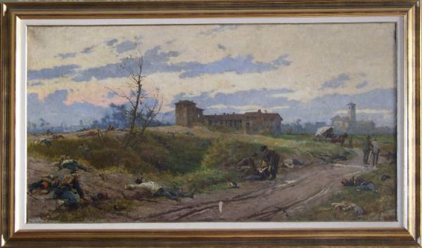 - NOTIZIE STORICO CRITICHE Il dipinto venne realizzato durante gli studi dell'autore all'Accademia di Brera sotto la guida di Giuseppe Bertini. In questo dipinto l'artista dimostra di aver ereditato dal maestro l'inclinazione verso un verismo partecipe e commosso, sospeso tra idealismo ed intimismo. La sconfitta non è rappresentata come un evento terrificante ma con un dolore pacato, e così la tumulazione dei morti ed i resti della battaglia. Il titolo del dipinto, "Fracta virtus", motto latino che significa "valore infranto", prepara lo spettatore ad un'immagine trasfigurata che funziona da ottimistico e trepido esempio morale, poichè "la morte deve edificare e suscitare emulazione, non turbare il pubblico" (Rochat, 1987, p. 38). I riferimeni pittorici sono, da una parte, Sebastiano de Albertis per la freschezza della pennellata e, dall'altra, Eleuterio Pagliano per la sua impostazione chiara, luminosa e solare.