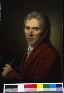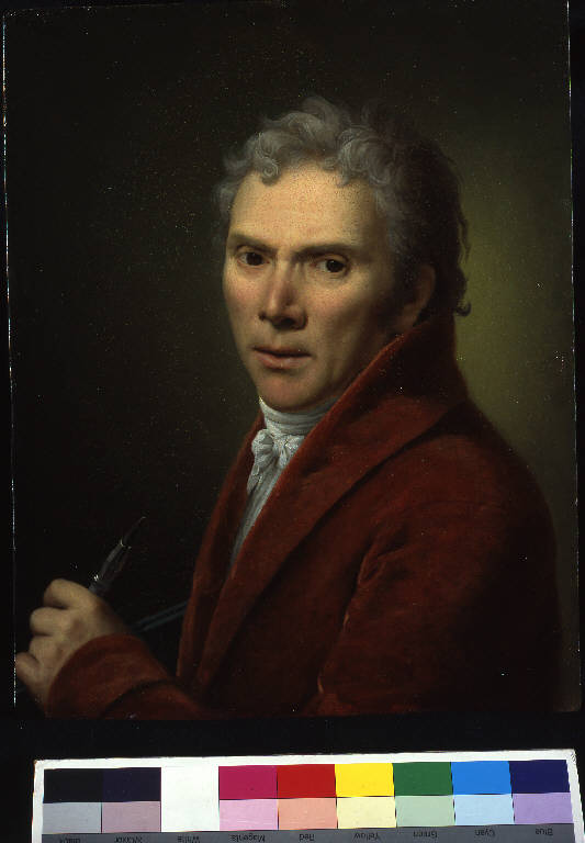 - NOTIZIE STORICO CRITICHE La tela, molto simile all'"Autoritratto" (1799 ca.) su tavola della Pinacoteca di Varallo (1799 ca.), ritrae il pittore poco dopo l'amputazione dell'avambraccio destro, come dimostra il fatto che sta reggendo il pennello con la mano sinistra. Sicuramente, il dipinto venne eseguito dopo il cartonetto con la "Prodigalità di Alessandro verso la famiglia di Dario", indicato come "ultima opera eseguita con la mano destra", come recita l'iscrizione manoscritta. In questo ritratto, caratterizzato dall'intensità dolorosa dell'espressione, l'asciutezza dell'immagine che si staglia su un fondo monocromo, pare richiamarsi al maestro Anto Raphael Mengs. L'"Autoritratto" su rame, "fatto con la mano sinistraquadri", insieme ad altro "in grande fatto nel 1794", alla "Sacra Famiglia" e ad altri sette piccoli quadri fu esposto dal Mazzola all'Esposizione di Brera organizzata il 30 aprile 1805 per l'incoronazione di Napoleone che, durante la visita in mostra, si soffermò ad ammirarne l'operato esprimendo lusinghiero giudizio.