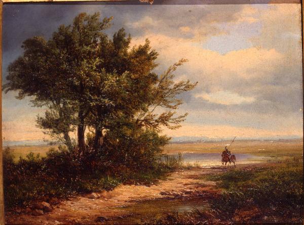 - NOTIZIE STORICO CRITICHE La tela, giunta in Accademia con il Legato Stampa (1900), nel 1855 comparve all'Esposizione di Brera, come omaggio del collezionista all'amico pittore da poco scomparso. Si tratta di uno dei rari paesaggi istoriati del Prinetti, probabilmente eseguito su commissione dello stesso Stampa al quale appartenevano pressochè tutte le opere del Prinetti. Il paesaggio, spoglio e di d'azegliana memoria, è movimentato solo dal gruppo di alberi sulla sinistra le cui fronde sono definite con minuzia attraverso piccoli tocchi di colore.
