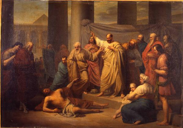- NOTIZIE STORICO CRITICHE La grande tela entrò nelle collezioni dell'Accademia perchè vincitrice del I premio del Grande Concorso per l'anno 1832. In quell'occasione, benchè partecipassero alla gara ben sette concorrenti, la giuria decretò vincitrice il dipinto del Sala con la seguente motivazione: "Bene aggruppata ed espressiva la composizione; animata e dignitosa la figura di S. Pietro; ragionevoli i partiti di pieghe; ben colto l'effetto del chiaroscuro, ma lacune delle figure degli apostoli hanno le gambe poco proporzionate; (...); alcune figure alla destra di S. Pietro non abbastanza bene collocate in ragione prospettica: del resto il colorito è soddisfacente sia in quanto al tocco che alla distribuzione della luce (...)". Ben diversa era la recensione pubblicata sulle pagine delle "Glorie" e quella dei compagni di concorso, i quali, invece, evidenziarono come il Sala avesse illustrato pedissequamente l'episodio senza alcuna volontà di interpretare personalmente la scena. Della discussa opere del Sala, non venne evidenziata la raffinata ricerca iconografica: dagli arazzi di Raffaello per gli "Atti degli Apostoli", alla posa della donna che stringe tra le braccia il bambino tratta, invece, dalla raffaellesca "Cacciata di Eliodoro". Il dipinto venne successivamente riprodotto da Giovanni Cagnola nella raccolta di incisioni illustranti le opere vincitrici ai Grandi Concorsi di Brera.