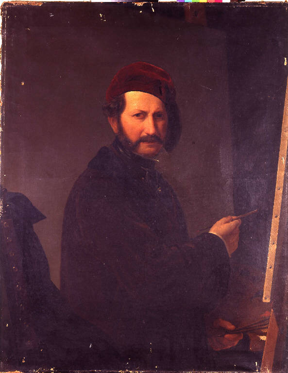 - NOTIZIE STORICO CRITICHE Nei registri dell'Accademia del 1947 e del 1980 il ritratto compare sempre come opera di ignoto: confrontato, invece, con l'analoga tela conservata agli Uffizi appare evidente che is tratta di un'opera del Sogni. La mano, è inequivocabilmente quella del noto artista milanese, come risulta dalla notevole abilità descrittiva e dalle tonalità cromatiche calde ravvivate da colpi di luce. Rispetto alla tela degli Uffizi, richiesta dal direttore della Galleria fiorentina nel 1863, la tela braidense rivela una differenza di formato che determina un diverso rapporto tra la figura e lo sfondo. Se il quadro degli Uffizi è condotto in una maniera più precisa e dettagliata, quello dell'Accademia è trattato con una maniera più larga e immedita: ne deriva un'immagine più intimistica a cui, però, non manca affatto quella forza espressiva presente nel ritratto fiorentino. Altri autoritratti del Sogni vennero esposti anche in occasioni delle mostre braidensi del 1831 e del 1853.