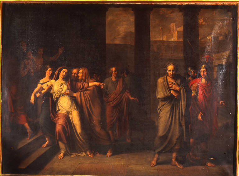 - NOTIZIE STORICO CRITICHE La tela, presentata al Concorso di I classe indetto dall'Accademia di Brera per il 1822 e, contestualmente, proclamata vincitrice, venne inviata da Roma dal pittore Giovanni Tebaldi, parmigiano, pensionato a Roma da S.M. la Duchessa di Parma. In quest'edizione, tra i sette concorrenti partecipanti il premio venne aggiudicato al dipinto n.4, ovvero quello del Tebaldi, nel quale la commissione evidenziò "la perizia maggiore nel disegno, (...)l'espressione conveniente al momento preso a rapresentare, (...) lo stile più deciso di antichità nelle parti tutte, (...) i grandiosi partii delle pieghe, (...) l'accuratezza del dipinto" e lo sfondo idoneo alla rappresentazione. Il tema del dipinto prevedeva da un lato la rievocazione della classicità e dall'altro la rappresentazione di affetti straziati dalla triste partenza del poeta. I modelli tratti dalla statuaria antica per la rappresentazione delle figure vengono intessuti di pathos nella dettagliata resa dei volti e delle espressioni tanto che, per enfatizzare ancor più la drammaticità della scena, egli trae spunto dalle vicende biografiche di due personaggi suoi contemporanei: il viso di Ovidio pare corrispondere al ritratto di Ugo Foscolo, mentre quello di Cotta, l'amico indeciso se partire col poeta o rimanere a piangere con i parenti, potrebbe alludere a Vincenzo Monti. Infatti, il noto poeta milanese viveva appartato nella Milano asburgica, mentre il Foscolo dal 1815 era partito in esilio volontario. Dal quadro venne tratta un'incisione anonima per il volume miscellaneo "Grandi Concorsi...", edito nel 1843.