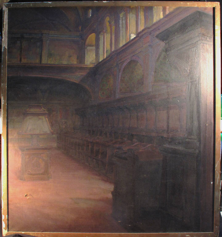 - NOTIZIE STORICO CRITICHE La tela è una veduta del coro delle Benedettine nella chiesa di San Maurizio a Milano, luogo già più volte ritratto da Luigi Bisi (1852), Amerino Cagnoni (1878) e Giovanni Pessina (1884). Per la sua impostazione fortemente prospettica tesa all'enfatizzazione della geometria dell'ambiente trascurante i preziosi affreschi ivi conservati, l'opera potrebbe essere un saggio eseguito da un allievo della Scuola di Prospettiva.