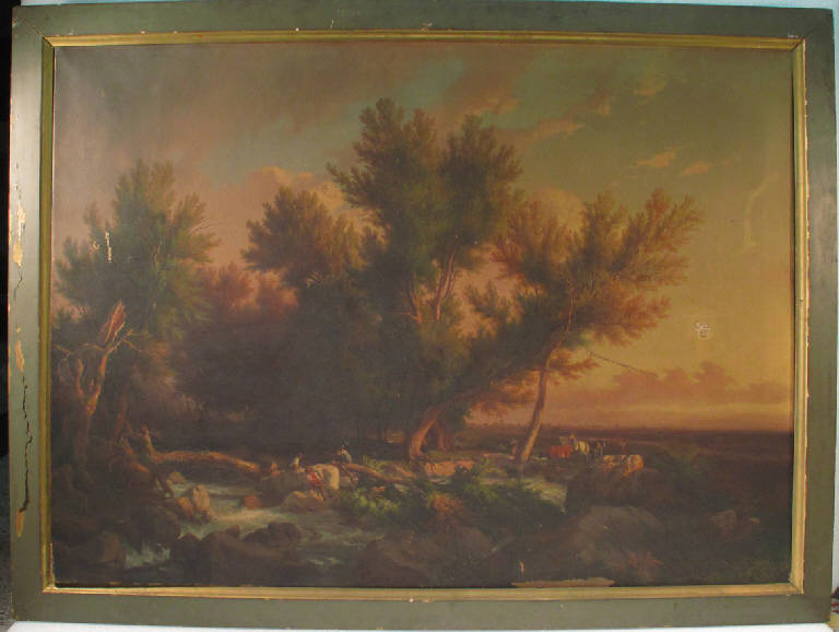 - NOTIZIE STORICO CRITICHE Il dipinto pervenne in Accademia perchè vincitore del Concorso di I classe dedicato alla pittura di paesaggio nel 1853. Il dipinto, impostato secondo uno schema convenzionale tipico della veduta, venne giudicato positivamente perchè "l'insieme del quadro, e segnatamente l'acqua del torrente, è bene imitata e di gradevole effetto". Abbandonato il paesaggio idiliaco, in questa tela emergon con chiarezza gli elementi del paesismo romantico - gli alberi rovesciati, il torrente impetuoso - tipico della pittura del D'Azeglio e piemontese.