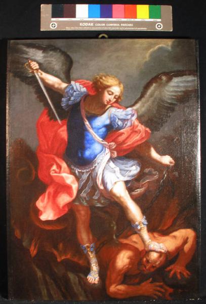 - NOTIZIE STORICO CRITICHE Si tratta di una delle numerose repliche del "San Michele" di Guido Reni commissionata dal cardinale S. Onofrio, fratello di papa Urbano VIII Barberini. Rispetto alla famosa pala d'altare, l'opera in questione presenta misure più contenute.