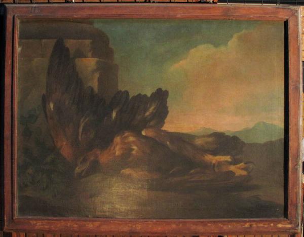 - NOTIZIE STORICO CRITICHE L'opera di autore ignoto, pervenuta in Accademia nel 1946 come dono (Registro, 1943), può essere considerata una variazione del tema della natura morta, ovvero un natura morta con cacciagione, genere che si diffuse in Europa nel Settecento quando la necessità di conoscenza dettagliata del mondo naturale influenzò anche l'ambito artistico. Ne è esempio l'opera del parmese Giuseppe Baldrighi (1722-1803), di cui si ricordano l'aquila morta raffigurata nell'"Ercole che libera Prometeo" e un'altra "Aquila" conservata in collezione privata.