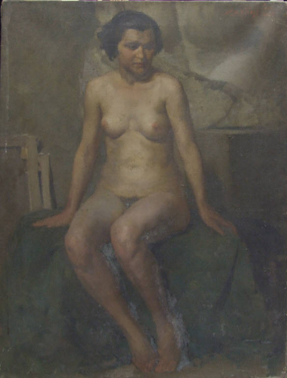 - NOTIZIE STORICO CRITICHE Il dipinto dovrebbe essere stato realizzato nel 1926 in occasione del Premio Hayez, come è indicato nell'iscrizione sul retro del telaio. Già nell'anno precedente, il Cavagnino aveva potuto accedere alla pensione Hayez con un'opera analoga a questa, "Mezza figura di donna seminuda" perchè l'autore "manifesta una serietà di intenti che promette bene. Ha cura del disegno e rispetto del vero". La tela in questione, rappresenta tuttavia una donna a figura intera, rendendo ardua l'identificazione. Ancora nel 1931, come dimostrano le fonti documentarie, insolitamente, l'artista aveva ottenuto di nuovo la pensione, per cui può essere plausibile l'ipotesi di ricollegare questa tela a tale circostanza, anche se, pare tuttavia difficile, ritenere che l'artsita a tale data fosse ancora legato ai modi scolastici.