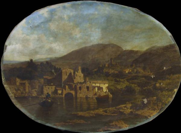 - NOTIZIE STORICO CRITICHE Il dipinto è un esempio significativo della pittura di paesaggio dell'autore che si rifà al vedutismo di Gaspar van Vittel nella composizione e nel formato ovale. Del paesaggio, probabilmente romano (sempre nello stesso anno Vittorio Emanuele II gli commisisona Ariccia, campagna romana), Cortese è particolarmente attento alla resa atmosferica, soprattutto nell'effetto delle nubi e del cielo.