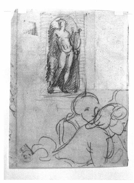 - NOTIZIE STORICO CRITICHE La statua di Apollo è copia sui grandi modelli classici su cui si esercitava l'Appiani durante il suo soggiorno romano (1791) ed in particolare dalla nicchia sinistra del fondale architettonico dell'affresco con la 'Scuola di Atene' di Raffaello nelle stanze del Vaticano. Lo schizzo è tratto dalla stampa a bulino di Marcantanio Raimondi, raffigurante 'Apollo Citaredo' (Roma, Istituto Nazionale per la grafica). Lo stesso motivo è utilizzato come motivo per la quinta neorinascimentale alle spalle di Josephine de Beauharnais nel dipinto di collezione privata dove la figura della futura imperatrice è assimilata ad unaVenere dei giardini (1806) (Canevari A. e Fusconi G. 2003, pag. 43)